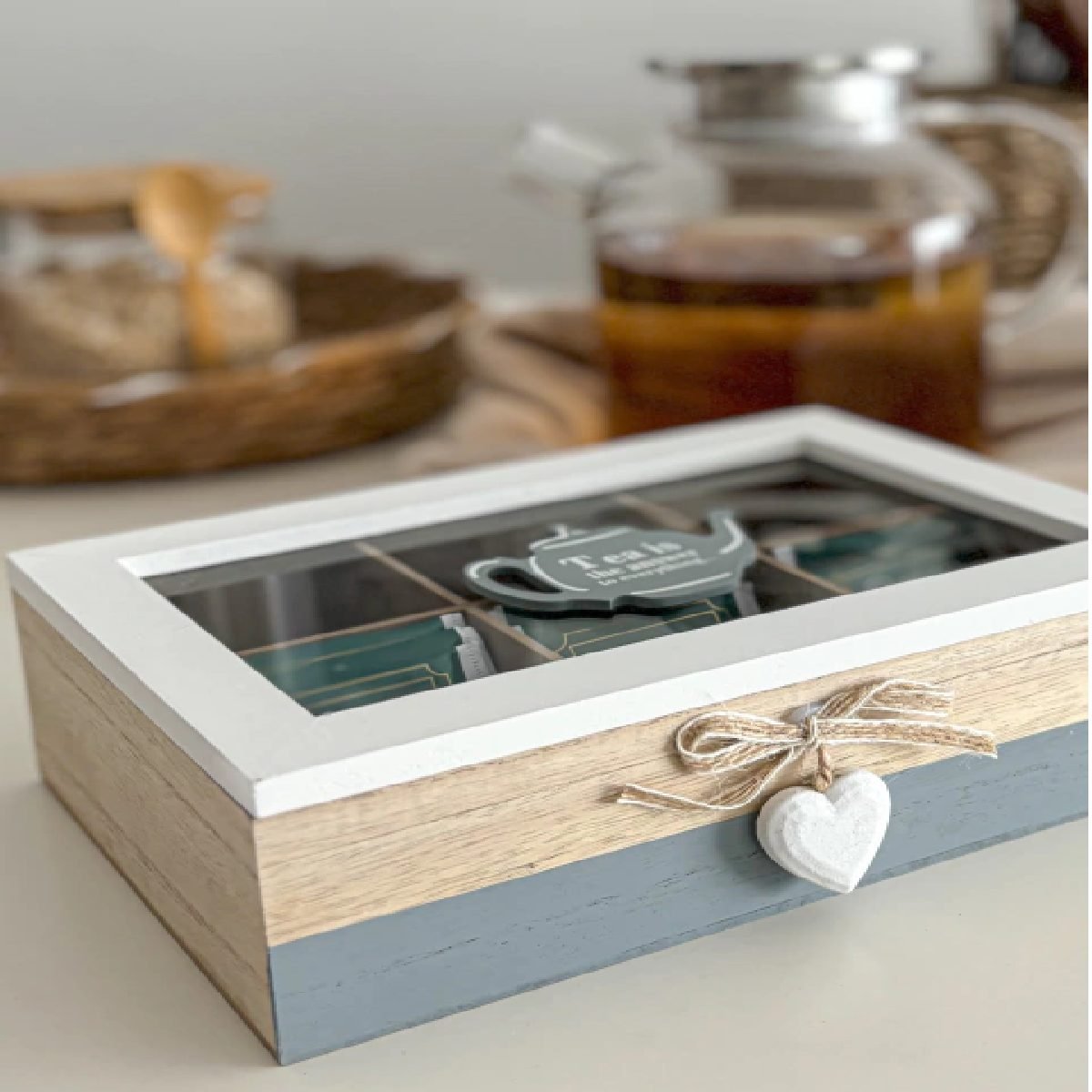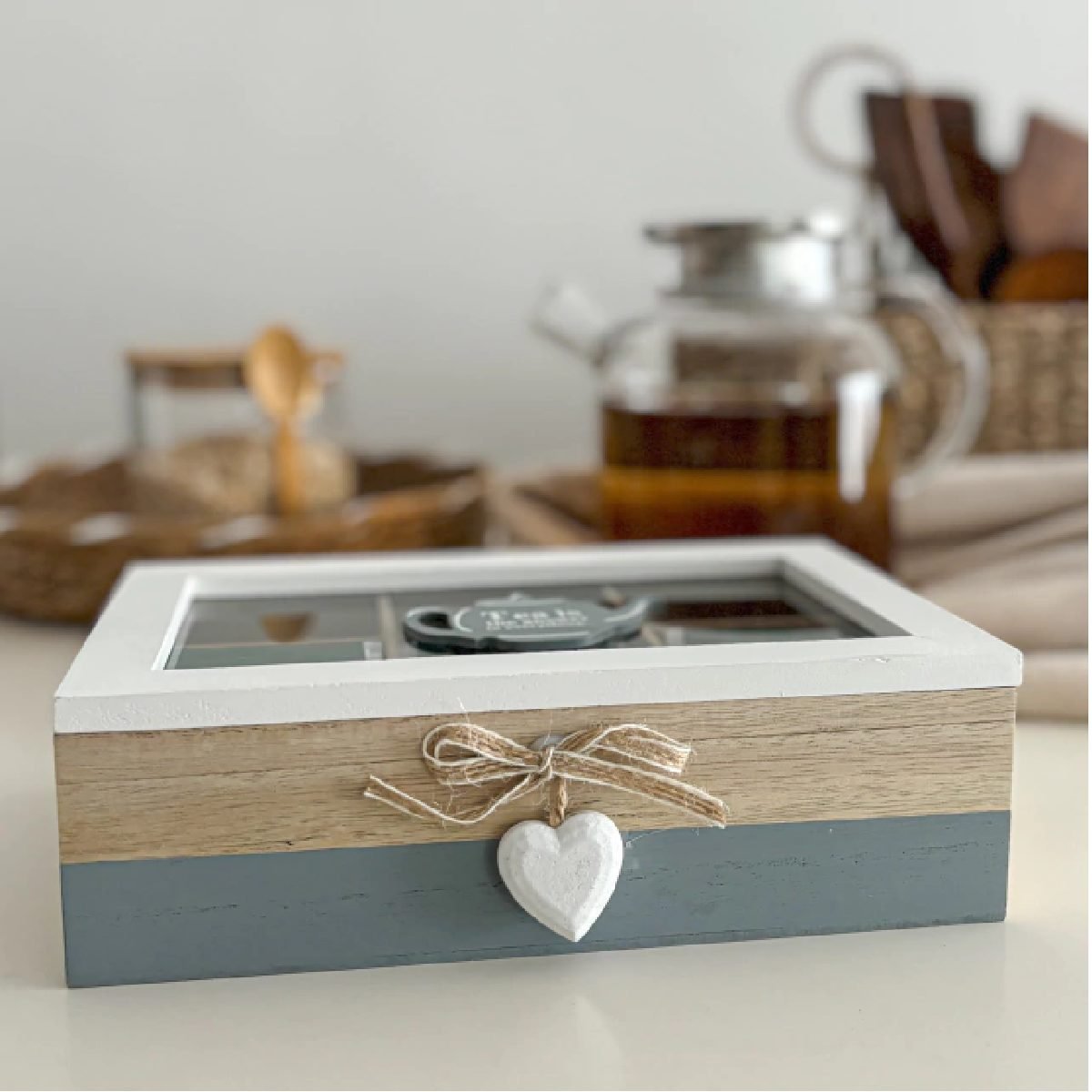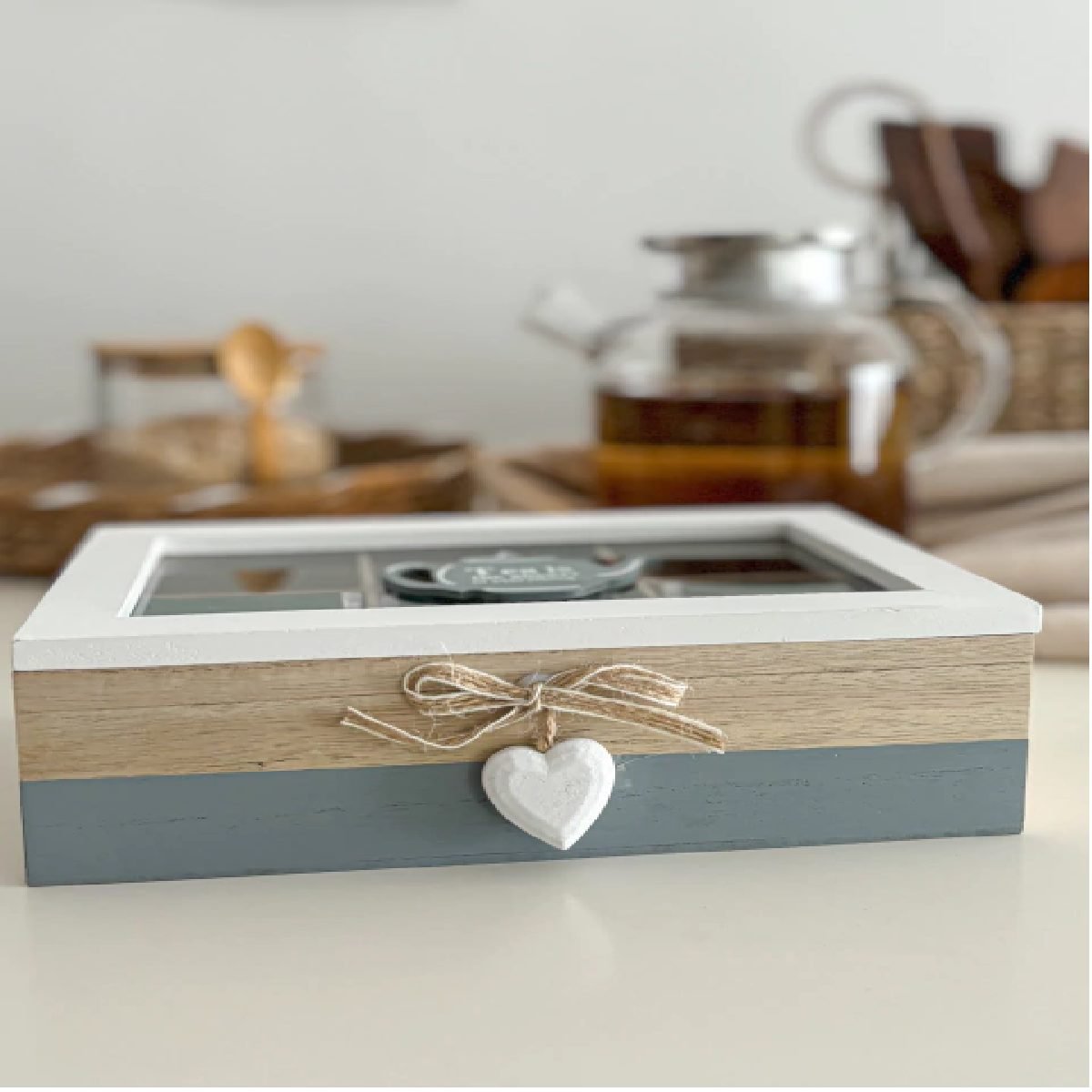 Caja de madera para tè con 6 divisiones de 23x16cm. Con su diseño elegante permite organizar de manera facil y pràctica sus infusiones para hacer de la hora del tè una experiencia ùnica y relajante.