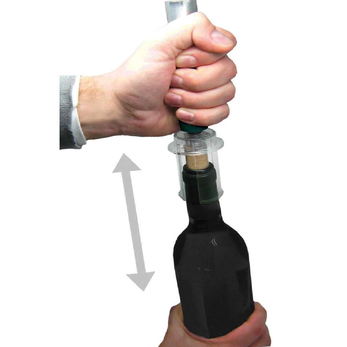 Inyectar aire realizando movimientos en el mango hasta que salga el corcho de la botella.