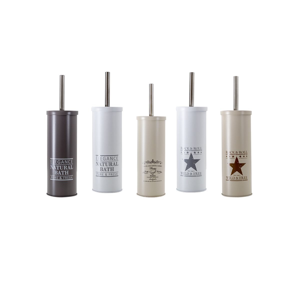 Escobilla de baño en material metal. Se compone de una base alta, una escobilla y por dentro un recipiente para facilitar su limpieza.