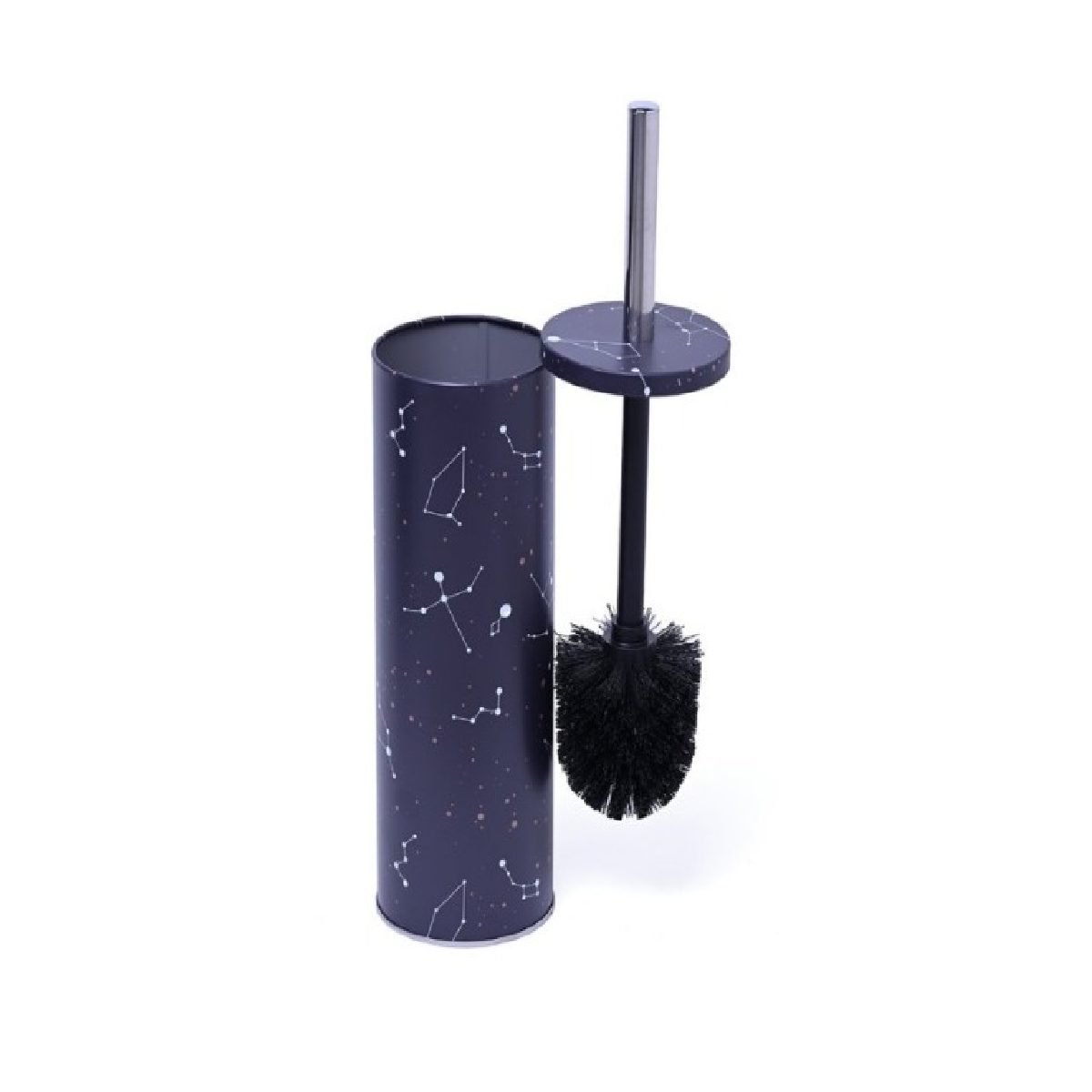Escobilla de baño en material metal. Se compone de una base alta, una escobilla y por dentro un recipiente para facilitar su limpieza.