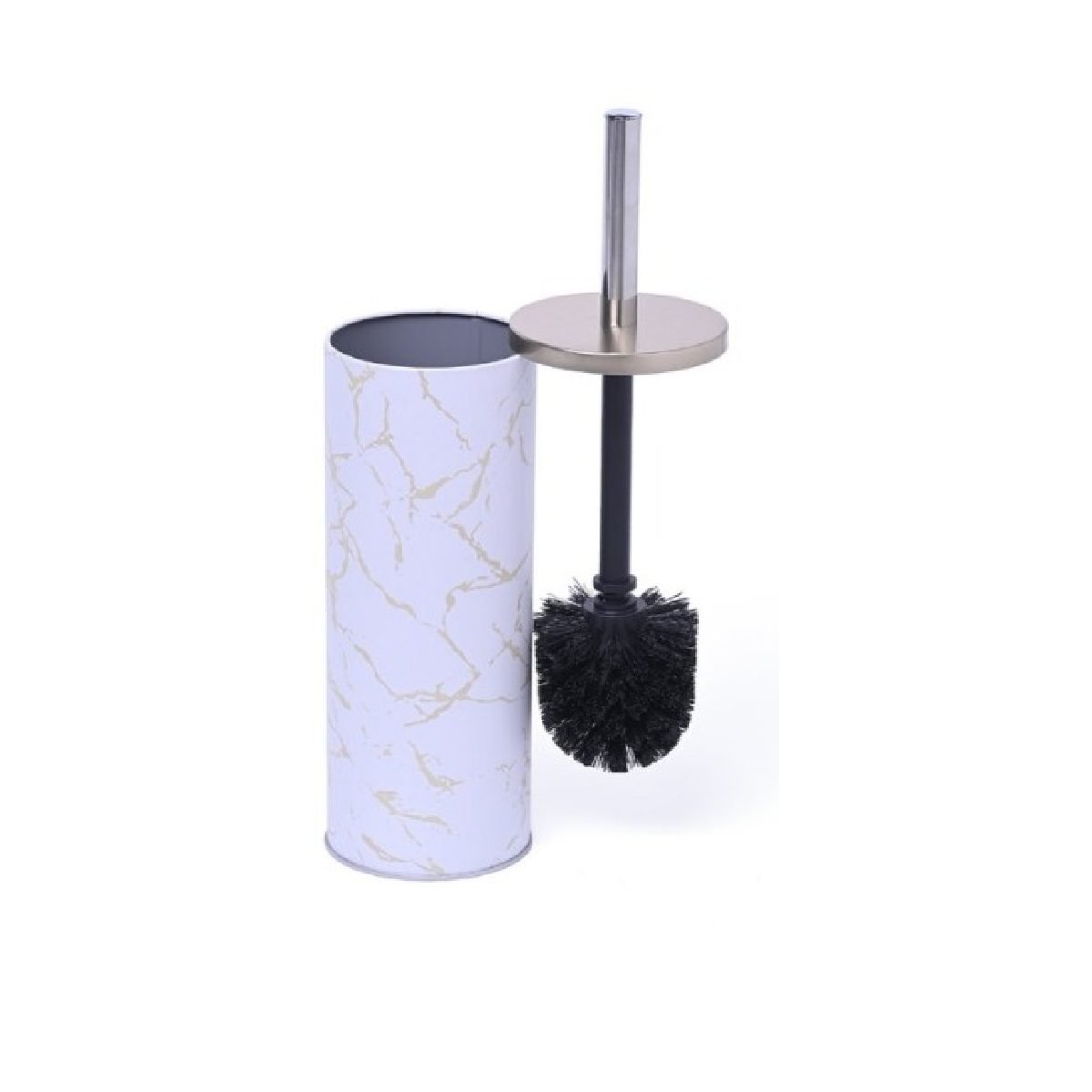 Escobilla de baño en material metal. Se compone de una base alta, una escobilla y por dentro un recipiente para facilitar su limpieza.