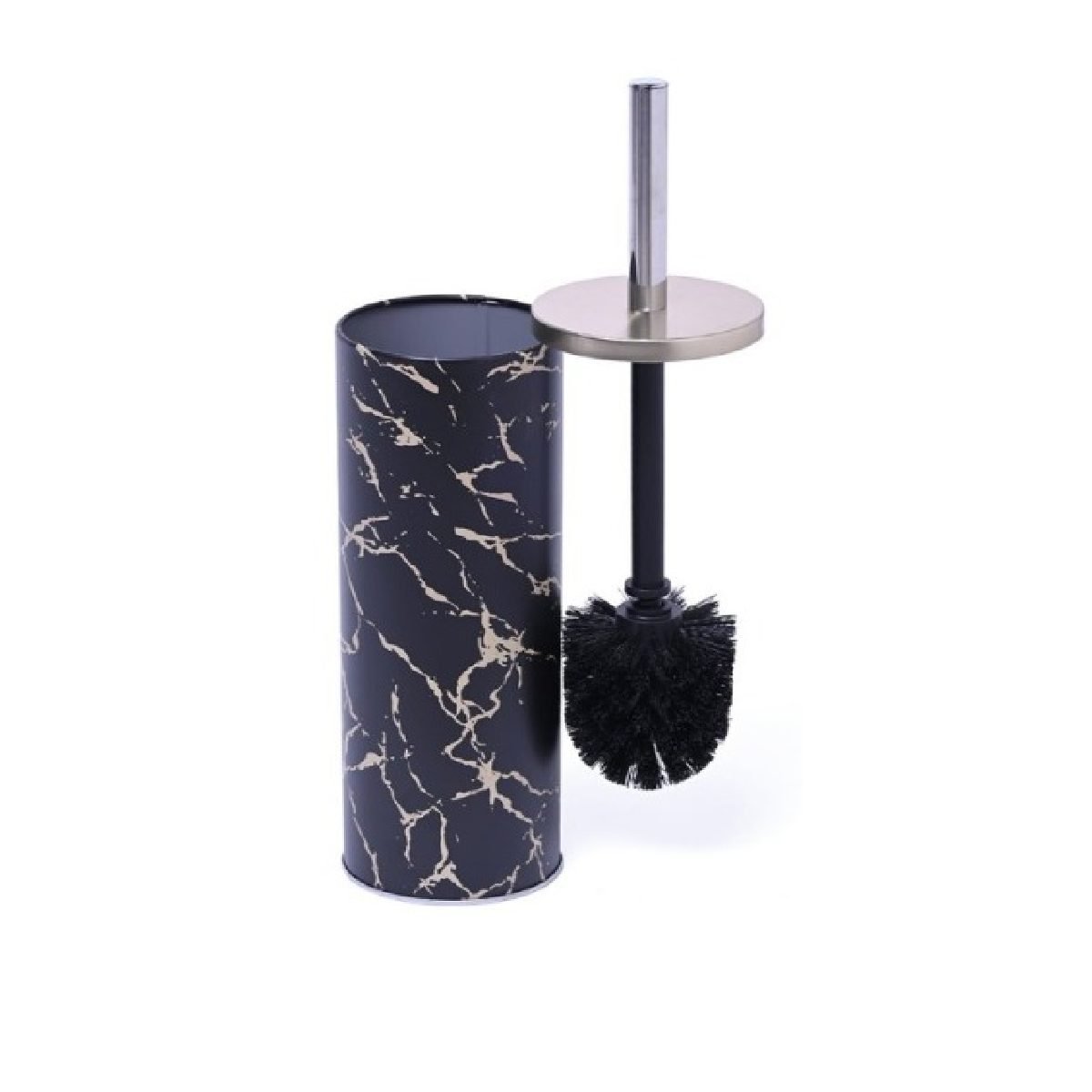 Escobilla de baño en material metal. Se compone de una base alta, una escobilla y por dentro un recipiente para facilitar su limpieza.