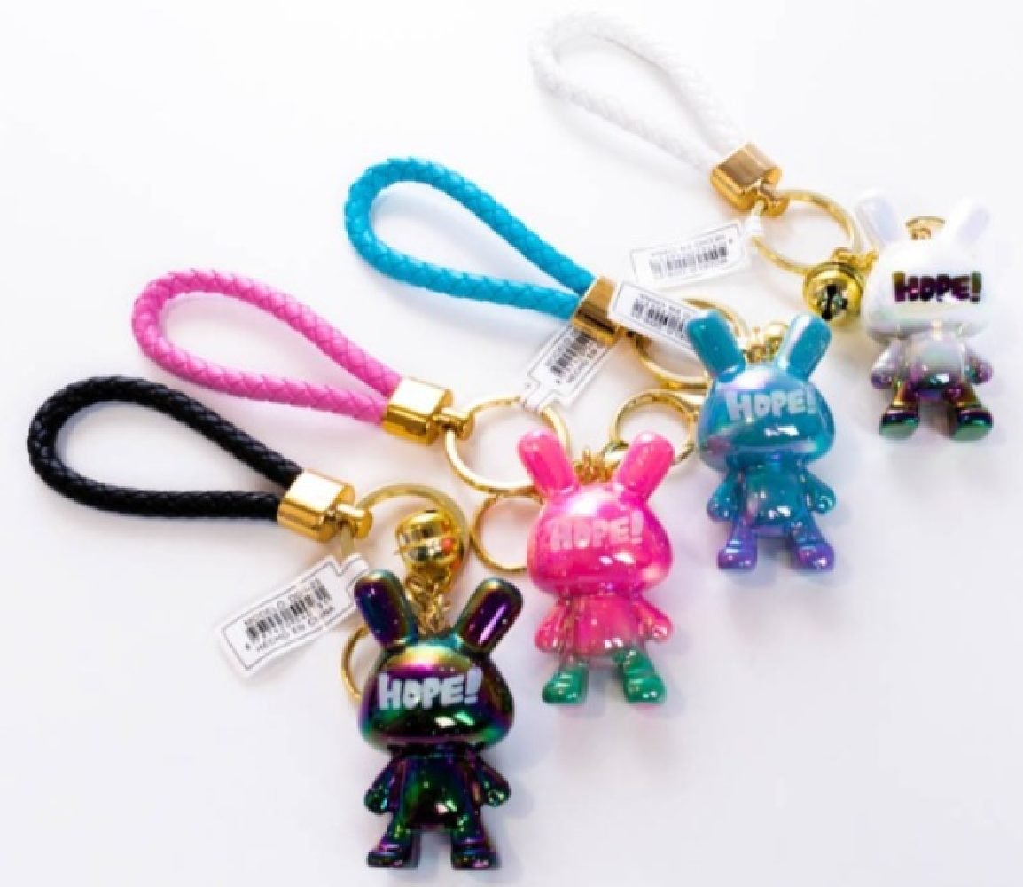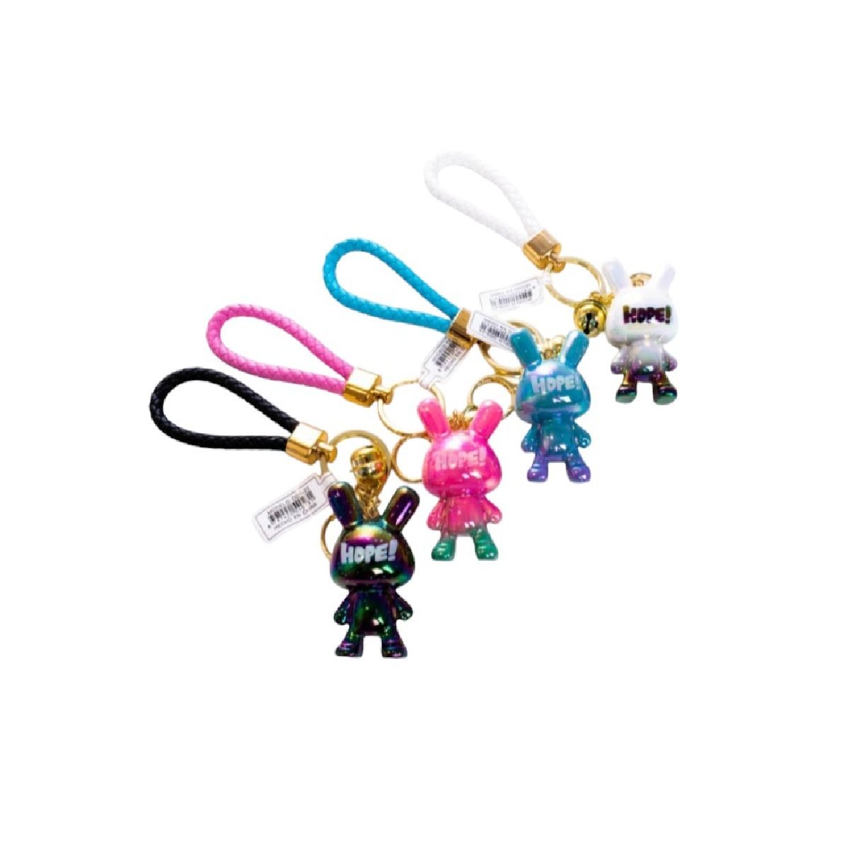 Llaveros de conejitos tornasolados, con correa de cuerina.