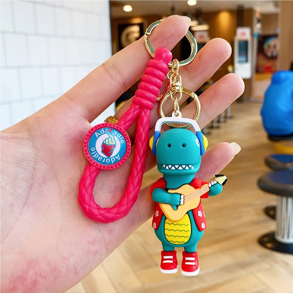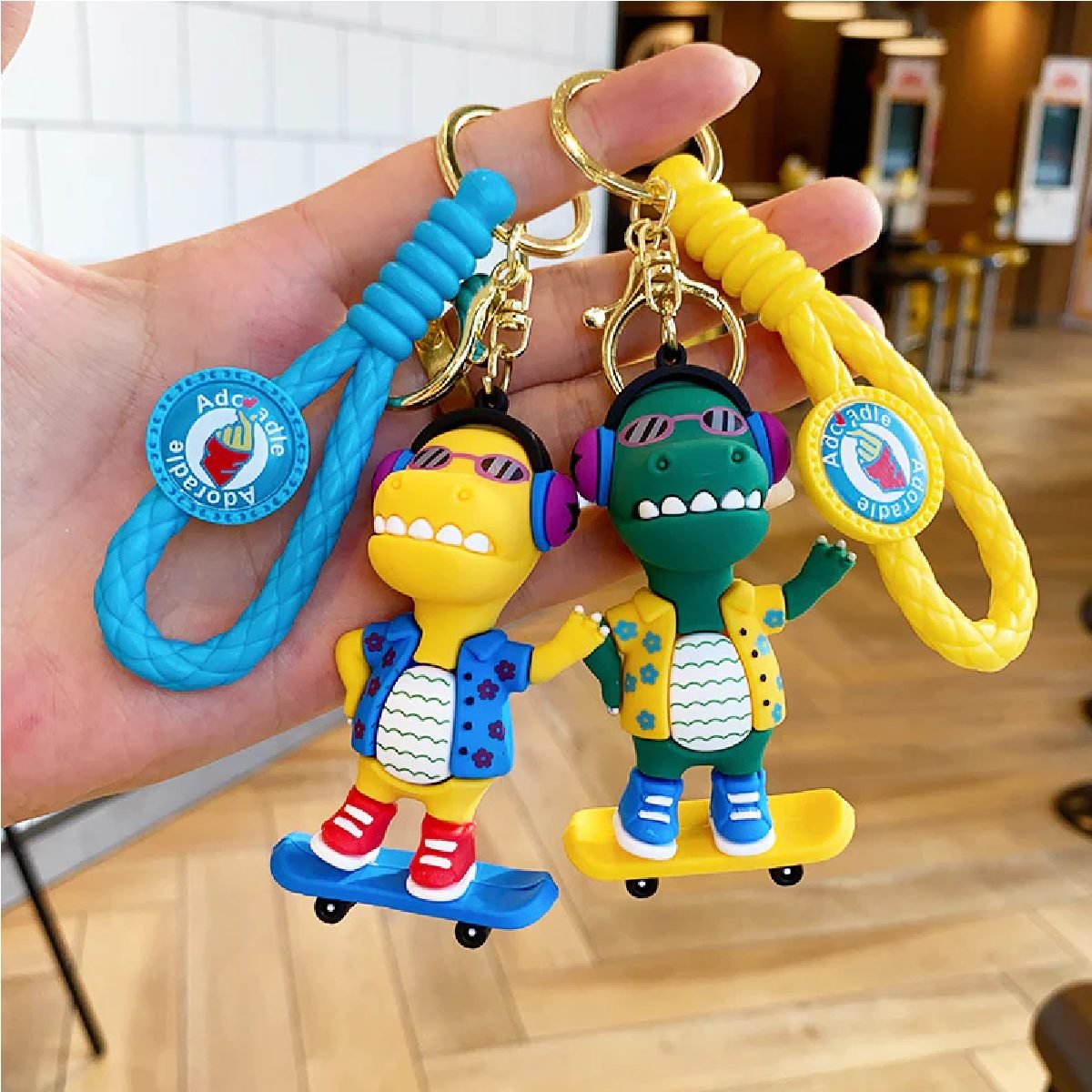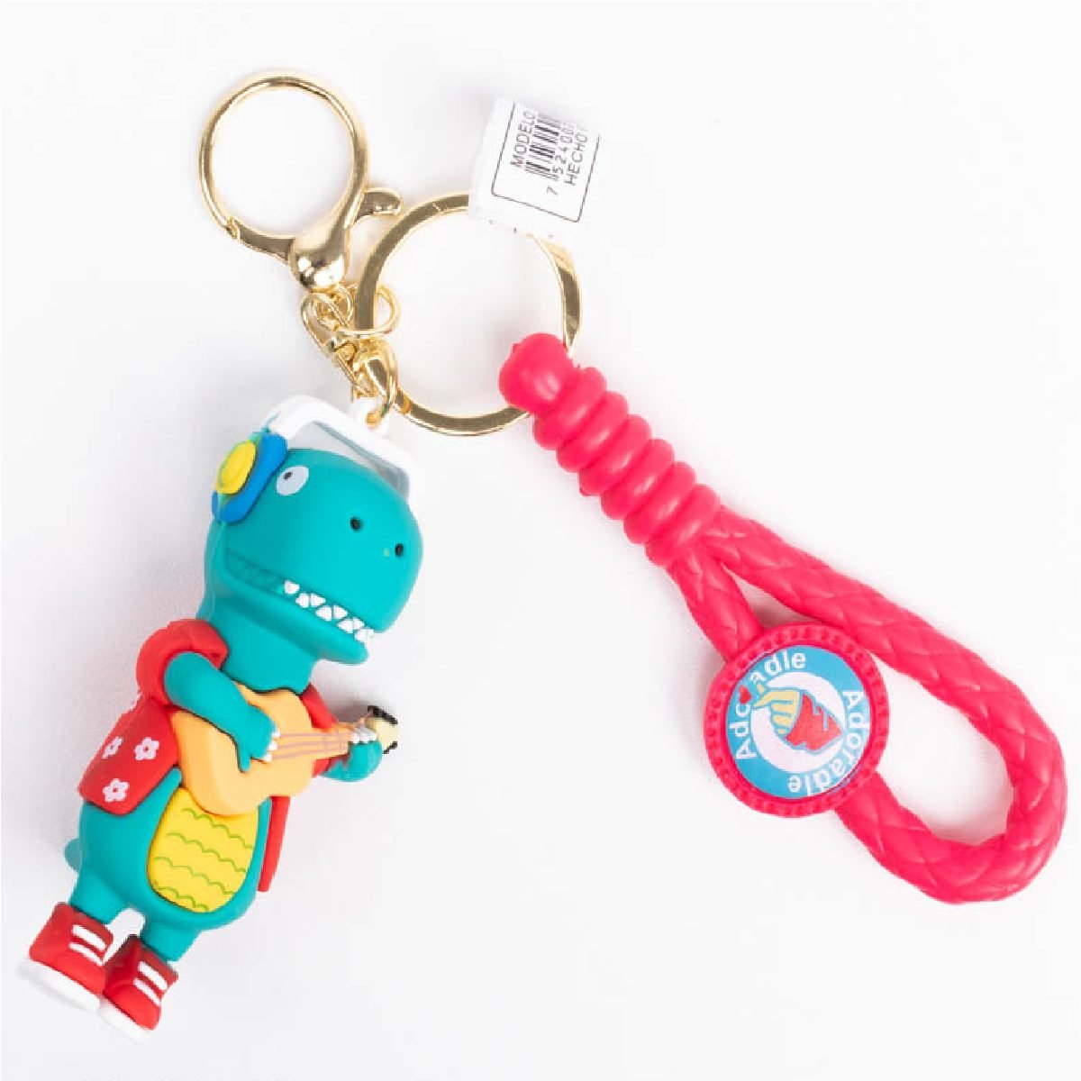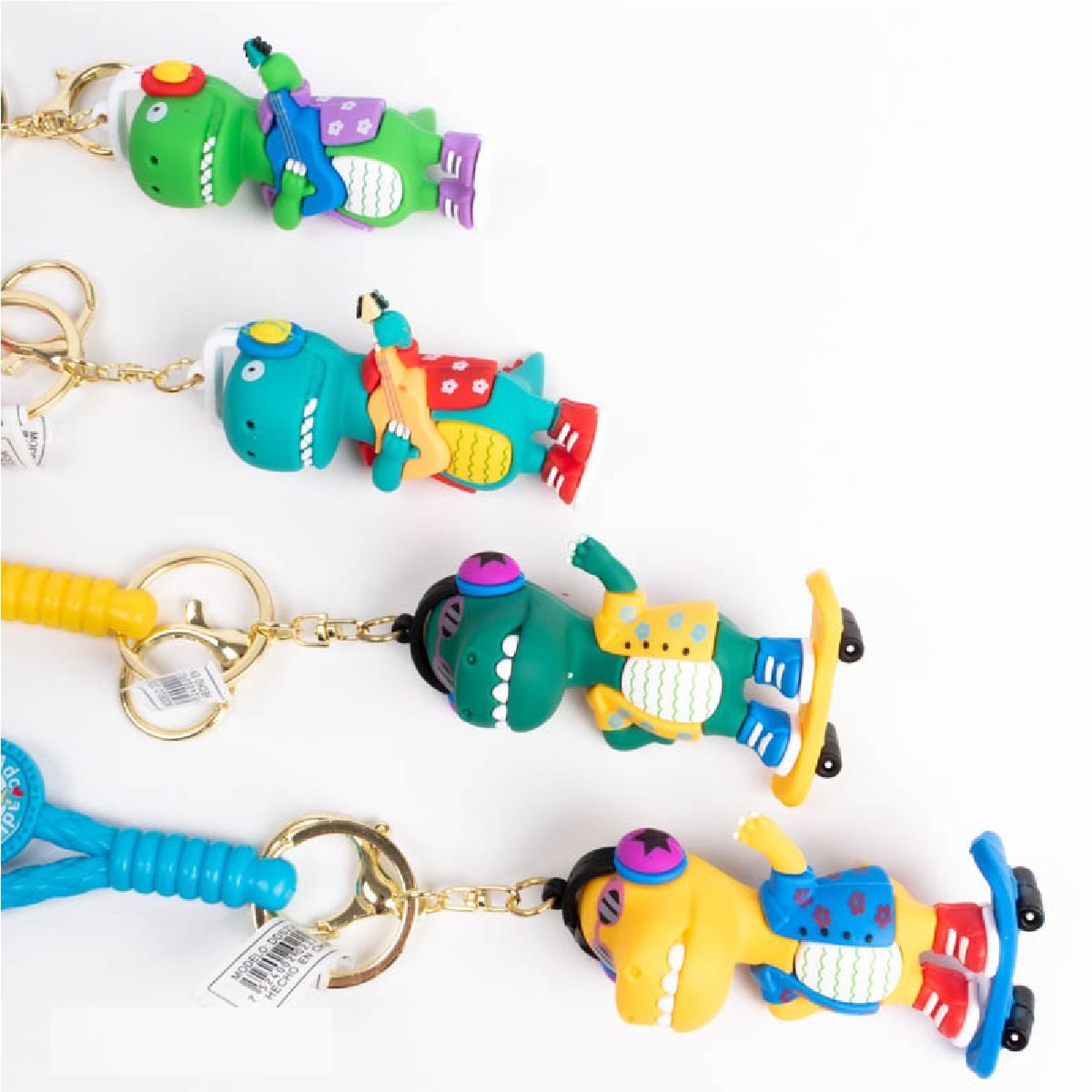 Llavero dinosaurio skate y guitarra correa de goma