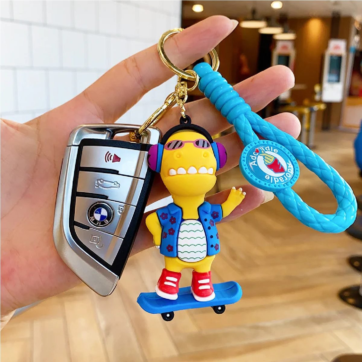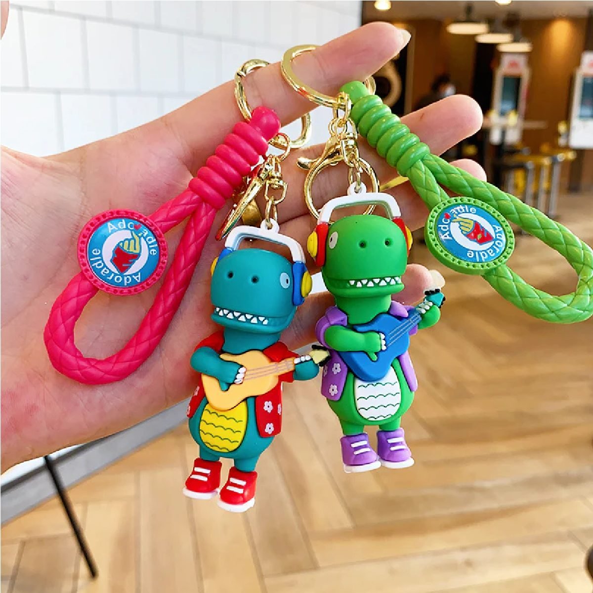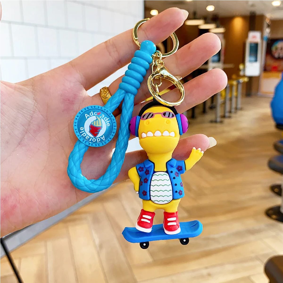 Llavero de dinosaurio diseño skate o guitarra con correa de goma ideal para decorar tus llaves y ponerle mucho estilo!!
