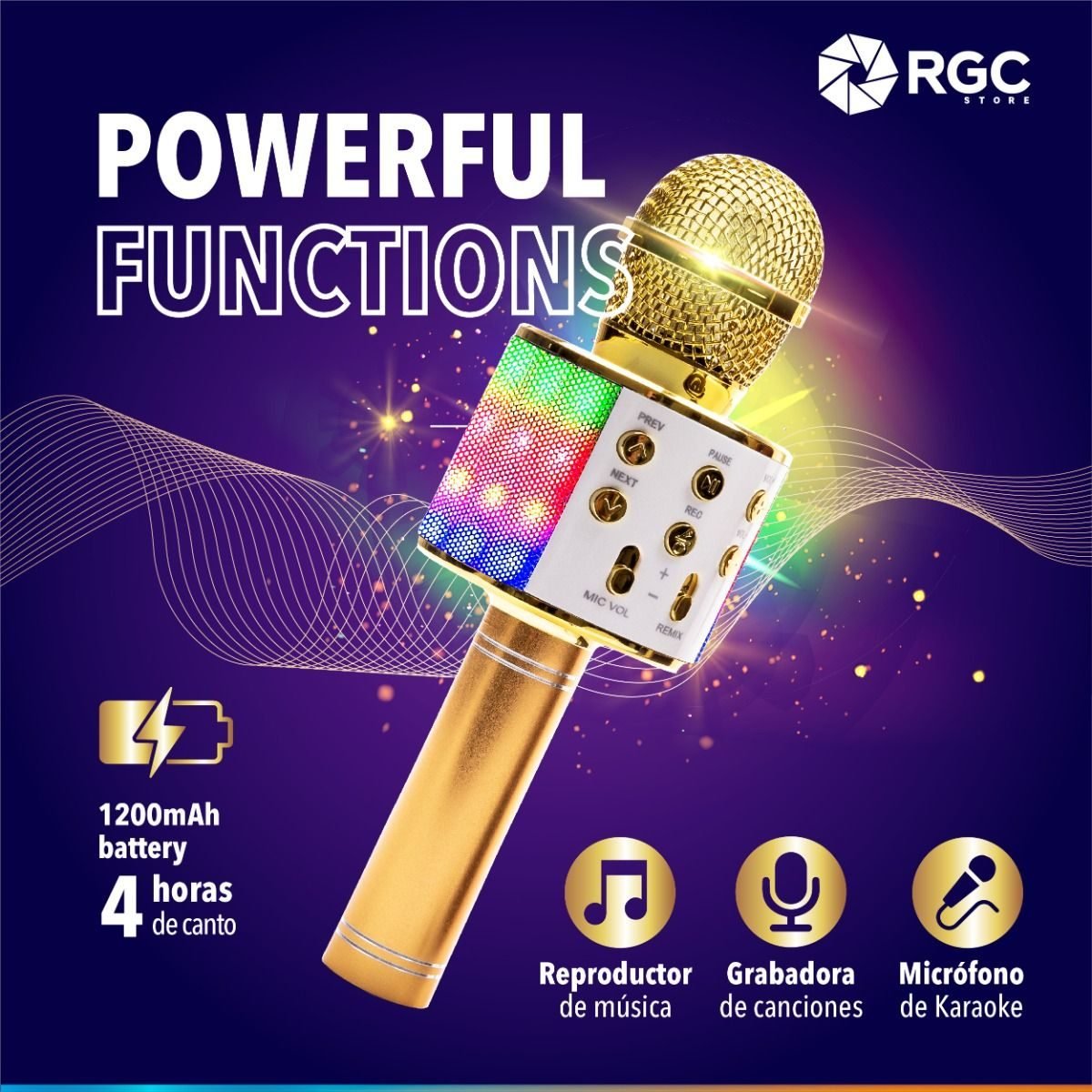 Micrófono inalámbrico con parlante incorporado que se conecta a tu celular por Bluetooth para que pongas tu música directo de Spotify, YouTube o de donde gustes. Sin necesidad de cables o estructuras, ni de quedarte siempre cerca del parlante. Utilízalo en tu casa, en una reunión, fiesta, en el auto, donde quieras. Se recarga vía USB con el cargador de celular o directo a tu computadora • Materiales: aleación de Aluminio + ABS + Cobre • Batería: litio 1200mAh • Duración de uso: 4 horas • Potencia de sonido: 3W*2 • Rango de frecuencia: 100Hz – 10KHz • Carga: DC5V • Sensibilidad: -40±3dB • Accesorios incluidos: Cable USB para Carga – Manual de Instrucciones