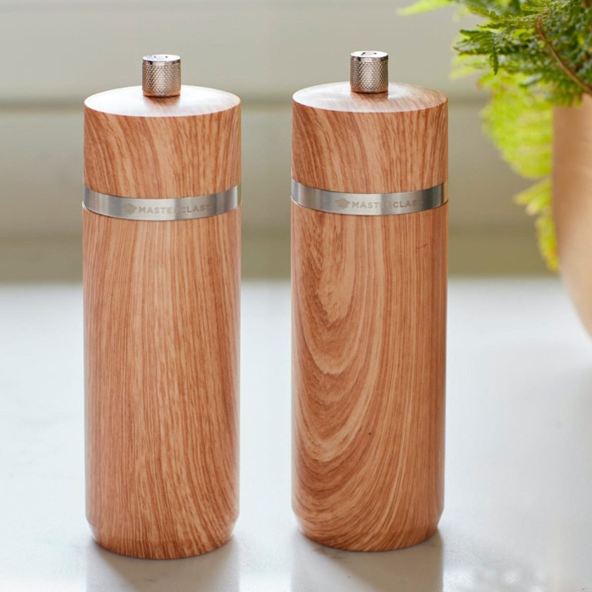 Molinillo de pimienta grande o molinillo de sal: usted elige. En cualquier caso, este molinillo individual de calidad le ayudará a moler granos de pimienta y sal gema con precisión, rapidez y estilo. Está fabricado en plástico resistente con un lujoso acabado que imita el aspecto de la madera de nogal. Como toque final, incorpora una banda metálica con el logotipo MasterClass grabado a láser, que le confiere un brillo que quedará fantástico tanto en la encimera de la cocina como en la mesa del comedor. Este molinillo de pimienta recargable puede rematarse con pomos metálicos intercambiables en forma de “S” o “P”, para que siempre sepa qué condimento contiene. El mecanismo de molienda, por su parte, está fabricado en cerámica resistente al óxido. Triturará fácilmente el condimento elegido, garantizando una trituración rápida y uniforme.