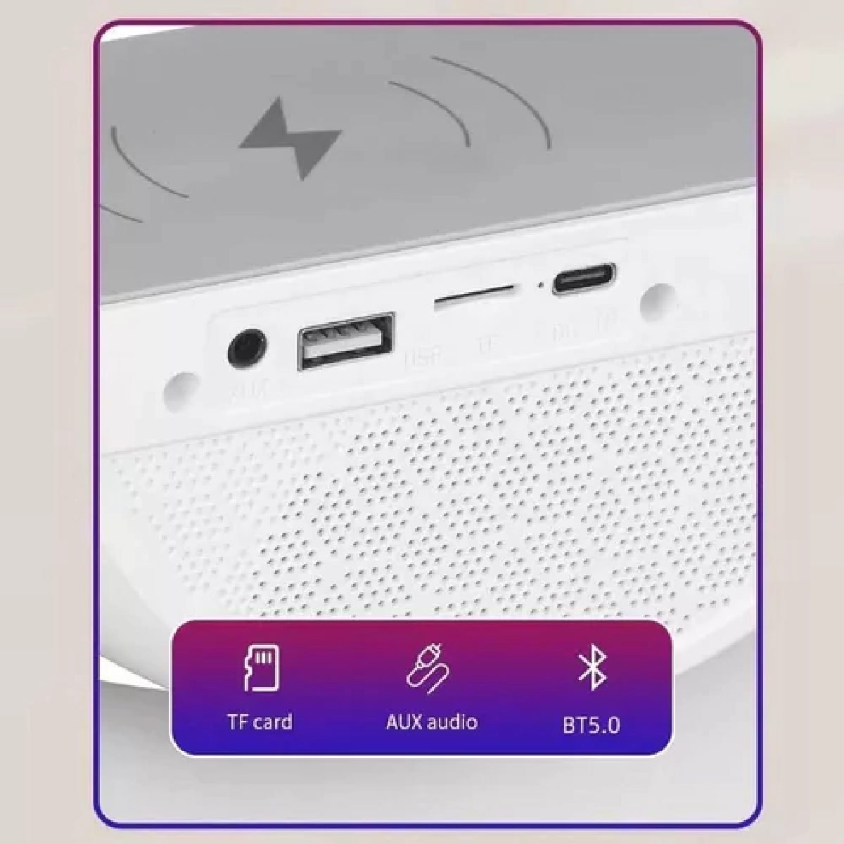 – Puede cargar su dispositivo de forma inalámbrica, con solo apoyarlo en la base de carga, mientras escucha música a través del parlante del cargador y disfruta del juego de luces.