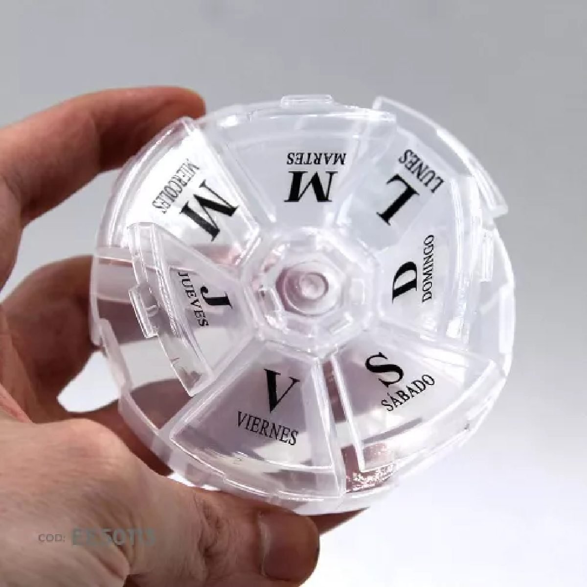 Pastillero organizador circular para medicamentos con 7 compartimientos, una division para cada dia de la semana.