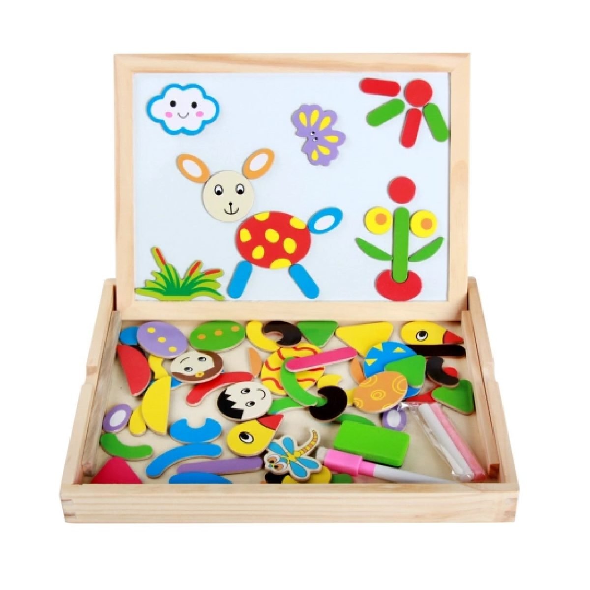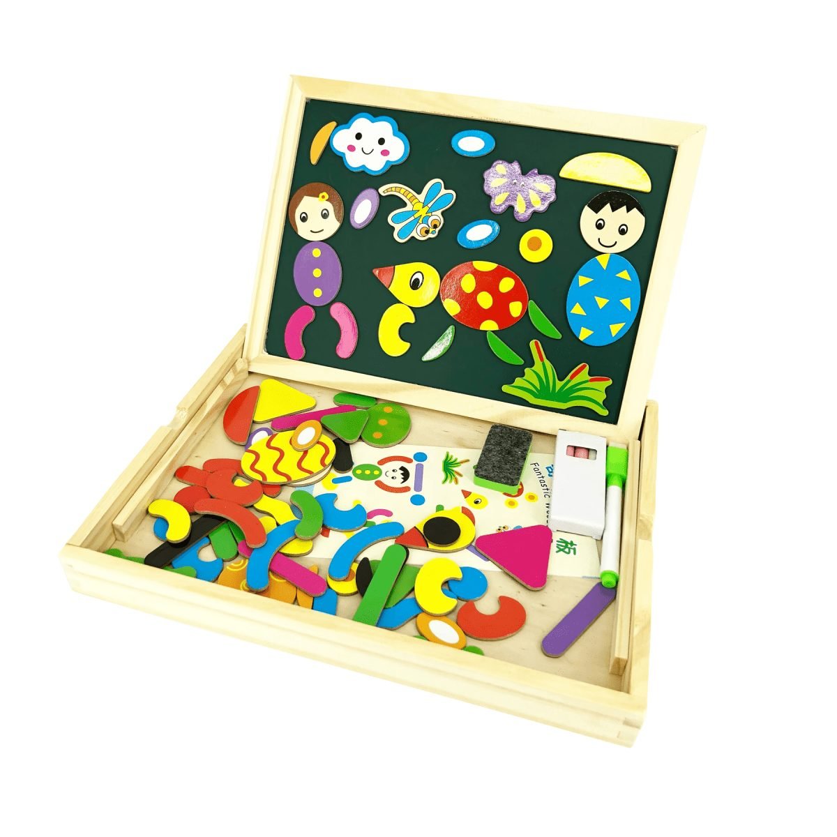 – Incluye: 70 piezas imantadas, 1 borrador, 2 tizas y papel con figuras para copiar.