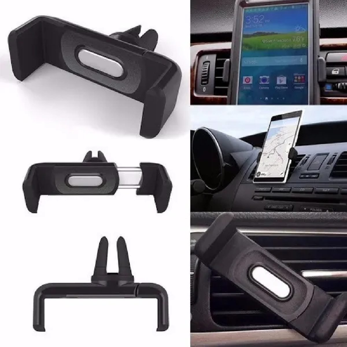 La manera de poner el equipo de manera rápida y sencilla al alcance de sus manos es sobre el ducto de ventilación del auto, asegurándose de que sea firme y pueda girar hasta un ángulo de 360° para que pueda usar programas de GPS como el Waze o google maps para evitar el tráfico. Compatible con cualquier equipo móvil con las características mencionadas.